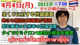 しゃべりタイ|2022年4月4日タイの朝のニュース紹介、 バンコク都知事選の候補者支持率、宝くじに対する世論調査、新たな宝くじを販売予定、ここ最近の寒さは周極渦による影響と発表、など