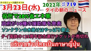 しゃべりタイ|2022年3月23日タイの朝のニュース紹介、結局ソンクラン水掛けは禁止、政府が10の援助策を決定、役所でのエネルギー20%節約案を内閣が決定、タイ国鉄の125周年記念運行チケットが売切れ、など
