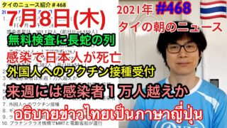 しゃべりタイ|2021年7月8日タイの朝のニュース紹介、感染で日本人が死亡、無料検査に長蛇の列、外国人へのワクチン接種受付、来週には感染者1万人越えか、など