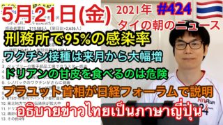 しゃべりタイ|2021年5月21日タイの朝のニュース紹介、刑務所で95%の感染率、ワクチン接種は来月から大幅増、ドリアンの甘皮を食べるのは危険、プラユット首相が日経フォーラムで説明、など